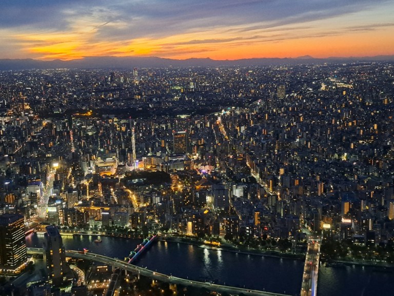 Later on, we head over to the iconic Tokyo Skytree for a breathtaking view over the city from 350 and 450 meters above ground. Not only do we see Mount Fuji far in the distance, but we stay until sunset, when the whole city lights up under our feet. A proper wow moment.